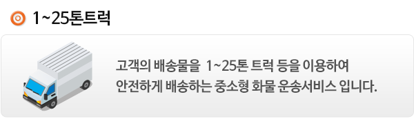 서울 경기 및 전국모든지역(일부 도서지역 제외) 기업 및 일반화물 - 1톤-25톤 전 차종 운송 가능 지방혼적화물 - 수도권에서 지방, 지방에서 수도권 운송시 경비절감을 위해 다른 화물과 같이 운송 제주도 운송 - 제주에서 내륙, 내륙에서 제주으로 화물을 운송 |